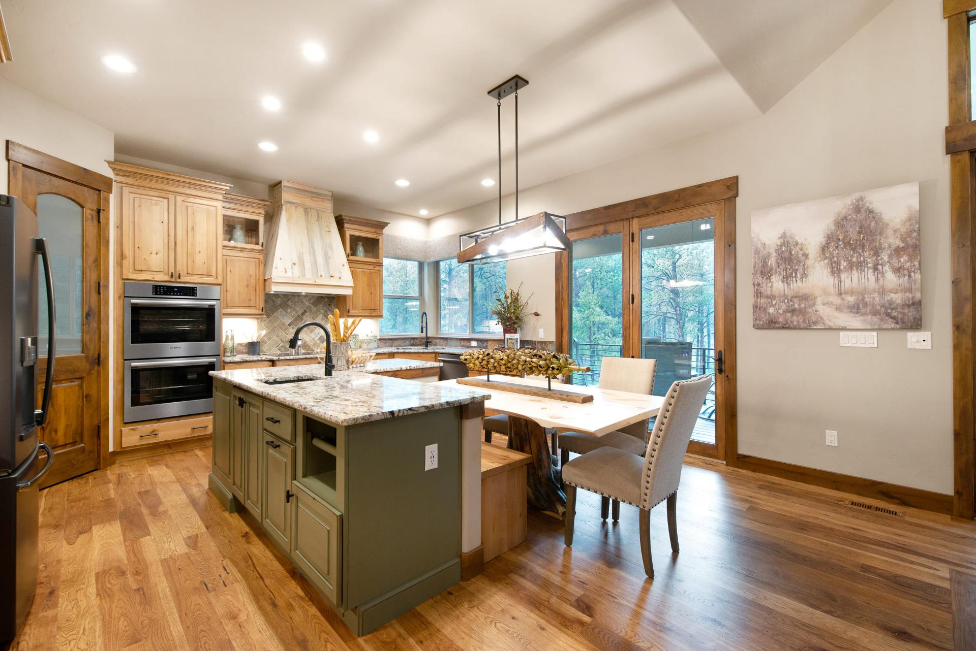 The kitchen is a wonder of modern and rustic beauty coming together. Almost completely adorned in real wood cabinetry and accents, this kitchen also brings along the modern touch of double-stacked ovens, a stovetop range hood, as well as an island with a built in dining table. Pair this with the adjacent deck to sip your coffee on in the morning and you have a kitchen that has all the warm feelings and utility you need.