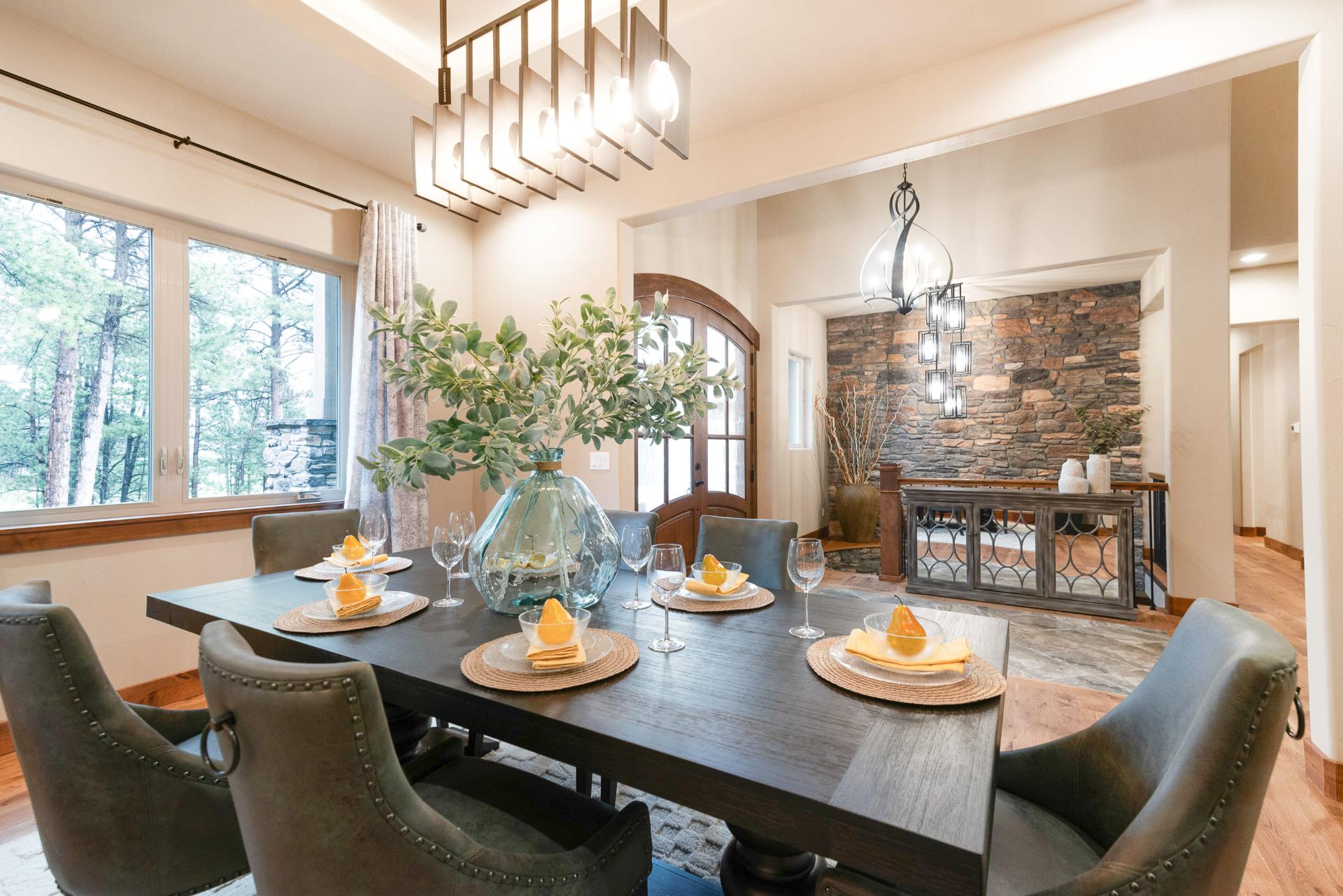 A warm and inviting home greets you with a pull-through driveway and a three-car garage. Warm wood double doors adorn the entrance as hardwood and stone tile meet in the entranceway to provide you with a landing pad that won’t hurt the hardwood on snowy Colorado winter days. Above you, a stainless steel chandelier screams modern art and elegantly matches the adjacent dining room.