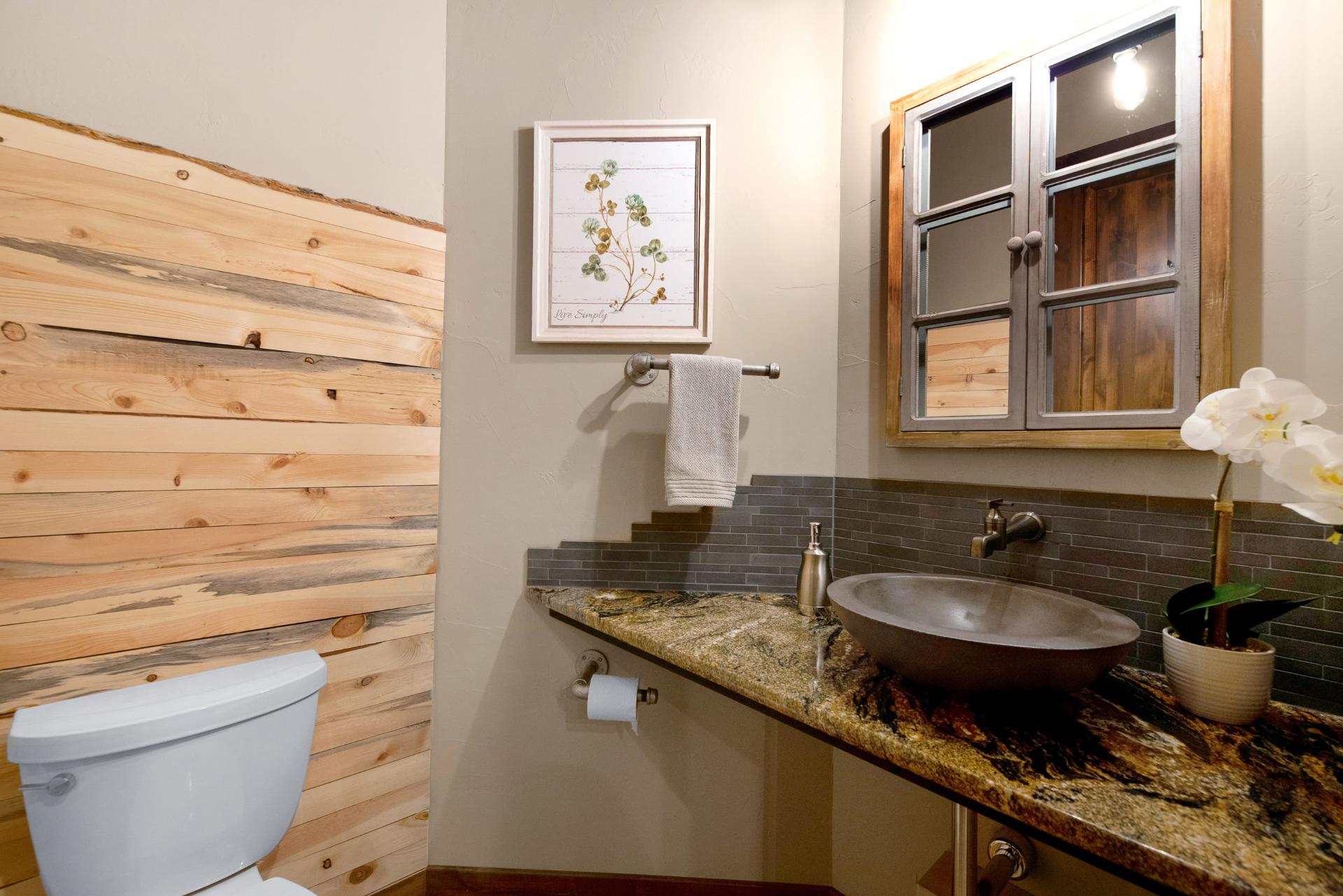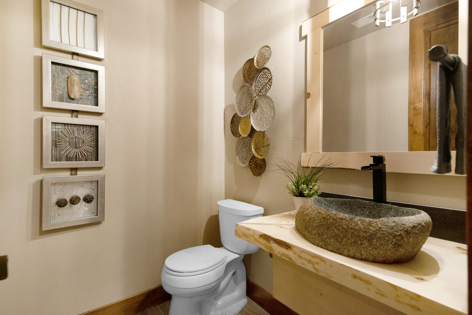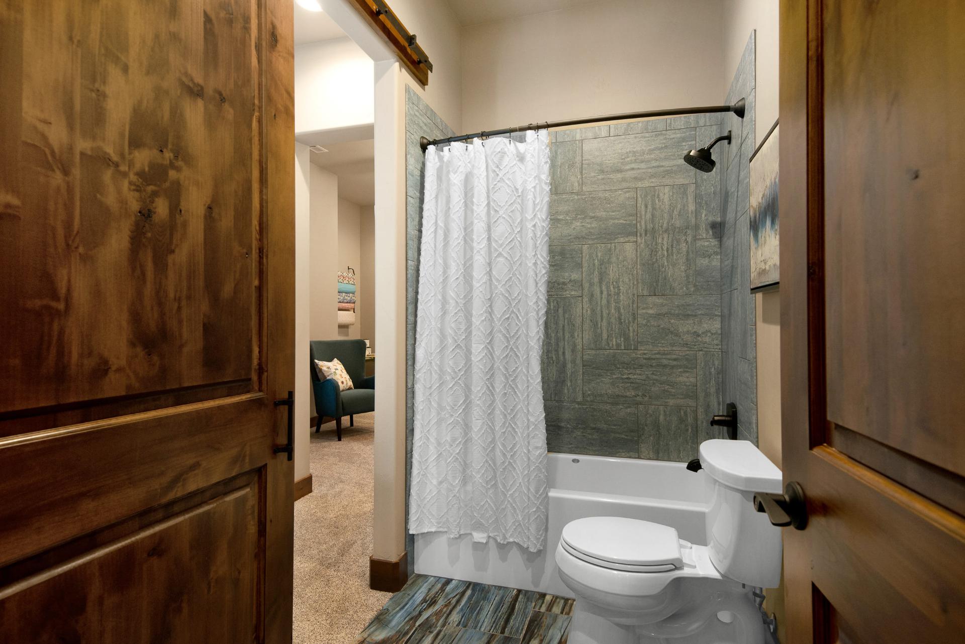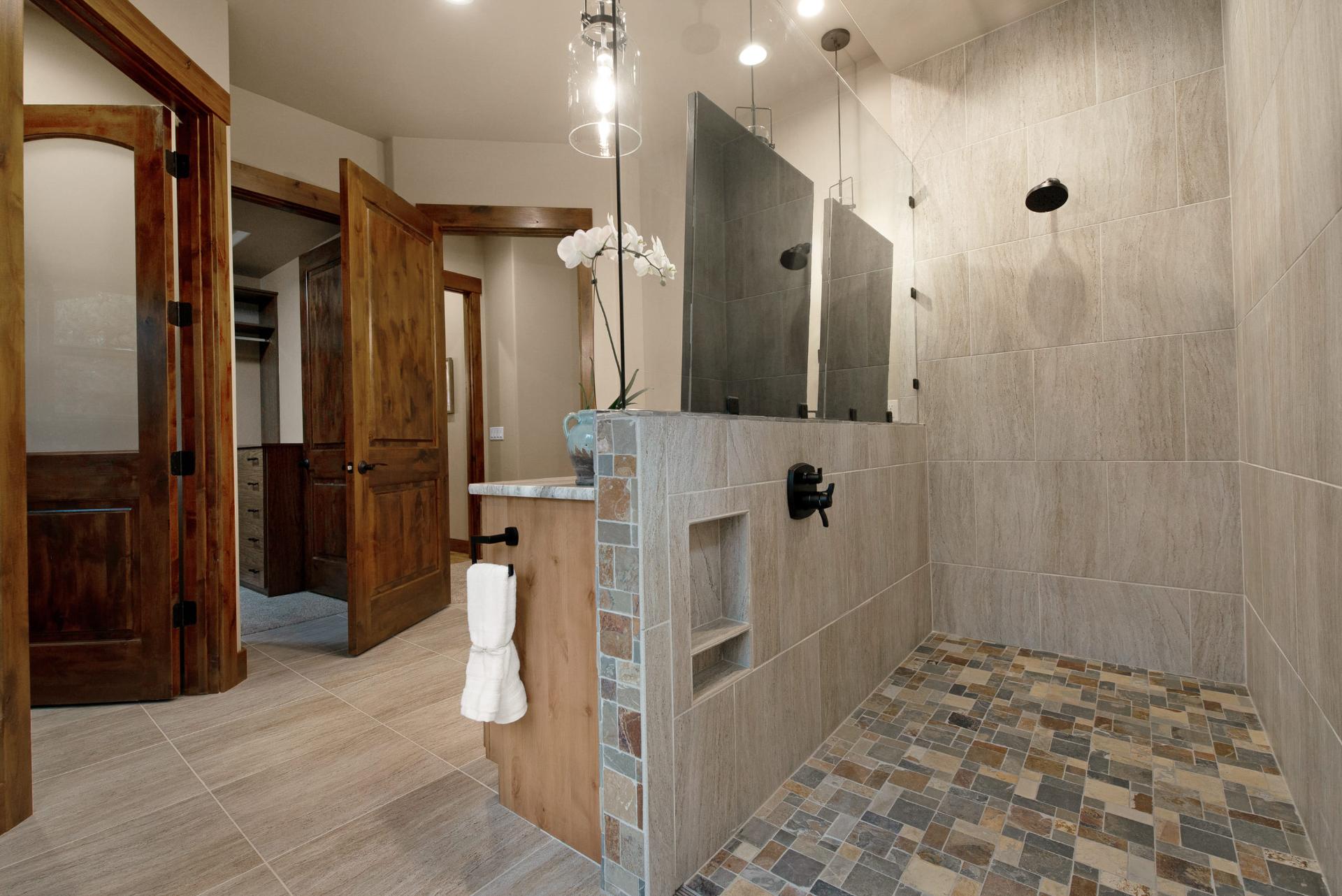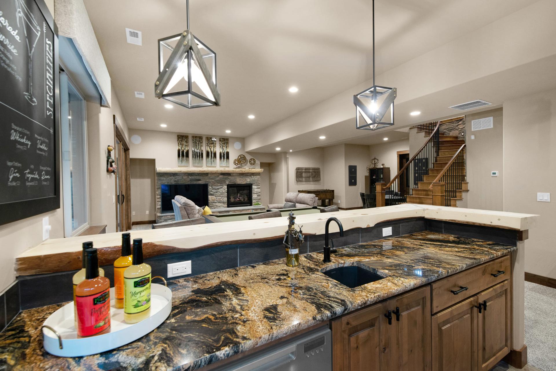 The downstairs provides a more dynamic living space, with a fireplace, a bar area fully equipped with a real wood bar, granite countertops, a dishwasher, and cold storage, a large living area, a spacious home theater, and a large patio outside. Two bedrooms connect on the bottom floor through a shared toilet and shower space, each with their own private sink area. It’s a luxurious and easy to maintain option for kids and guests, with stone tiling, rich dark woods, and deep bronze accents.